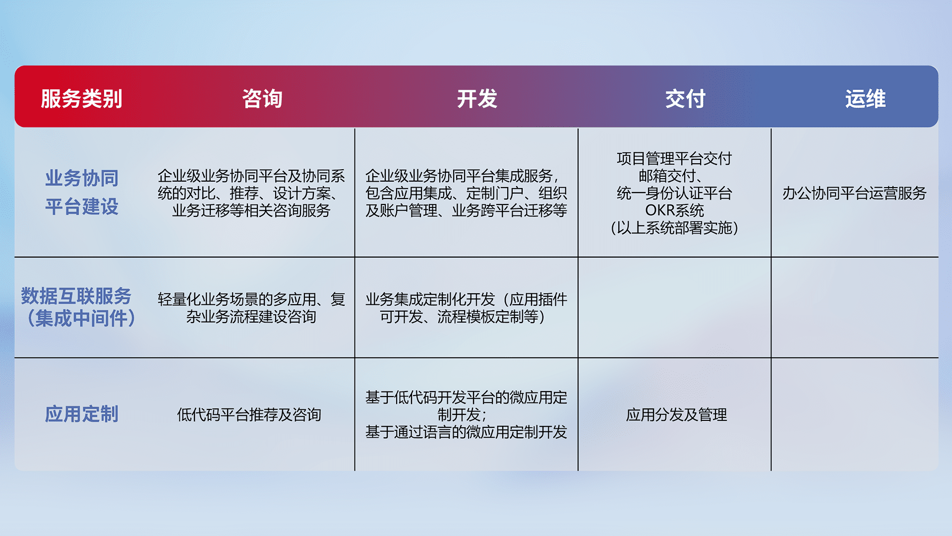针对钉钉、、企微、、IDaas等平台级产品提供产品的规划、、、方案、、、交付、、、、定制化开发等服务,,,实现如统一协同办公、、、、智能客户服务、、混合会议管理、、、智能数据查询、、、、等业务场景,,实现数字化转型。。。